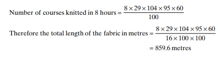 Example: Calculate the length in meters of a plain, single-jersey fabric knitted at 16 courses/cm on a 26-inch diameter 28-gauge circular machine having 104 feeds. The machine operates for 8 hours at 29 rpm at 95 per cent efficiency.