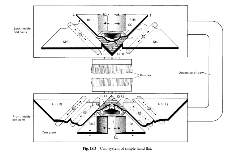The cam-carriage underside is shown by the figure. The needle butts are guided through the knitting system by the tracks that are formed by cams. The single knitting system cam-box is designed symmetrically. During a right to left traverse, it knits a course of loops on both the front bed and back bed needles. A second course is formed at the time of return left to right cam box traverse.